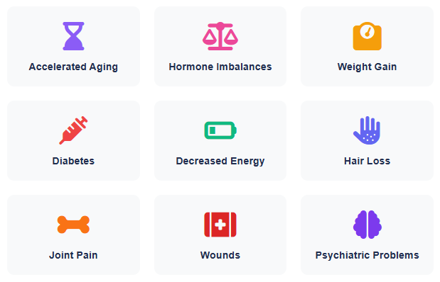 We diagnose and treat root causes of Accelerated Aging, Hormone Imbalances, Weight Gain, Diabetes, Decreased Energy, Hair Loss, Joint Pain, Wounds and Psychiatric Problems.